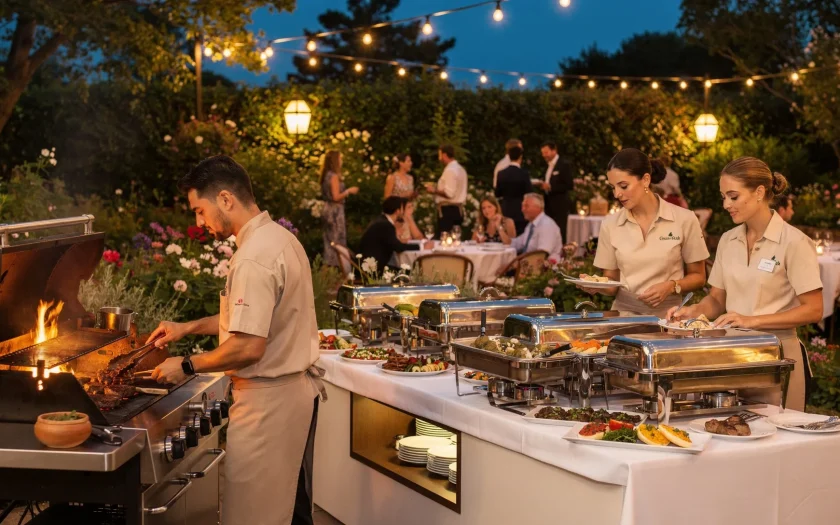 Backstage di un evento estivo in un ristorante con giardino, tra griglia, buffet e servizio all'aperto